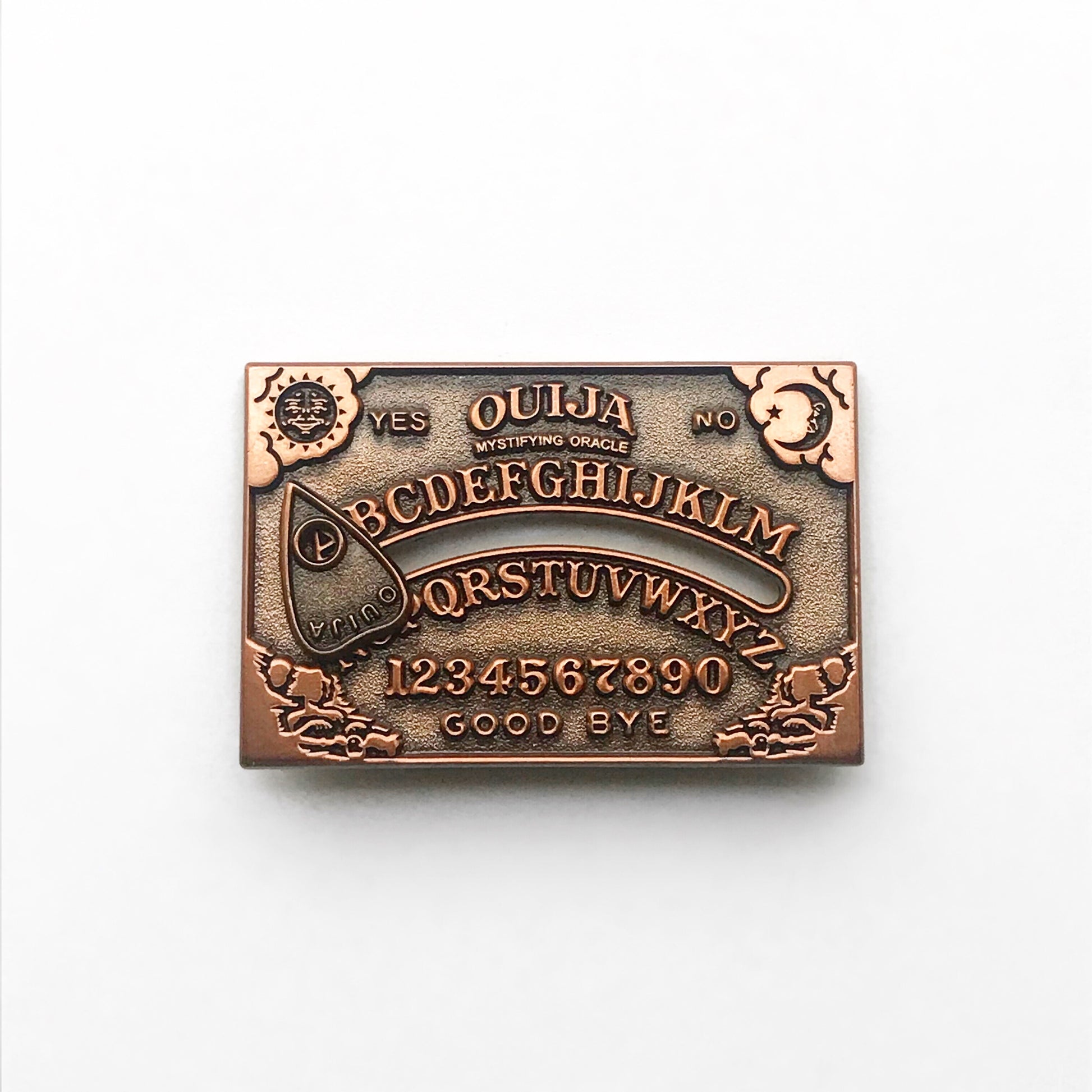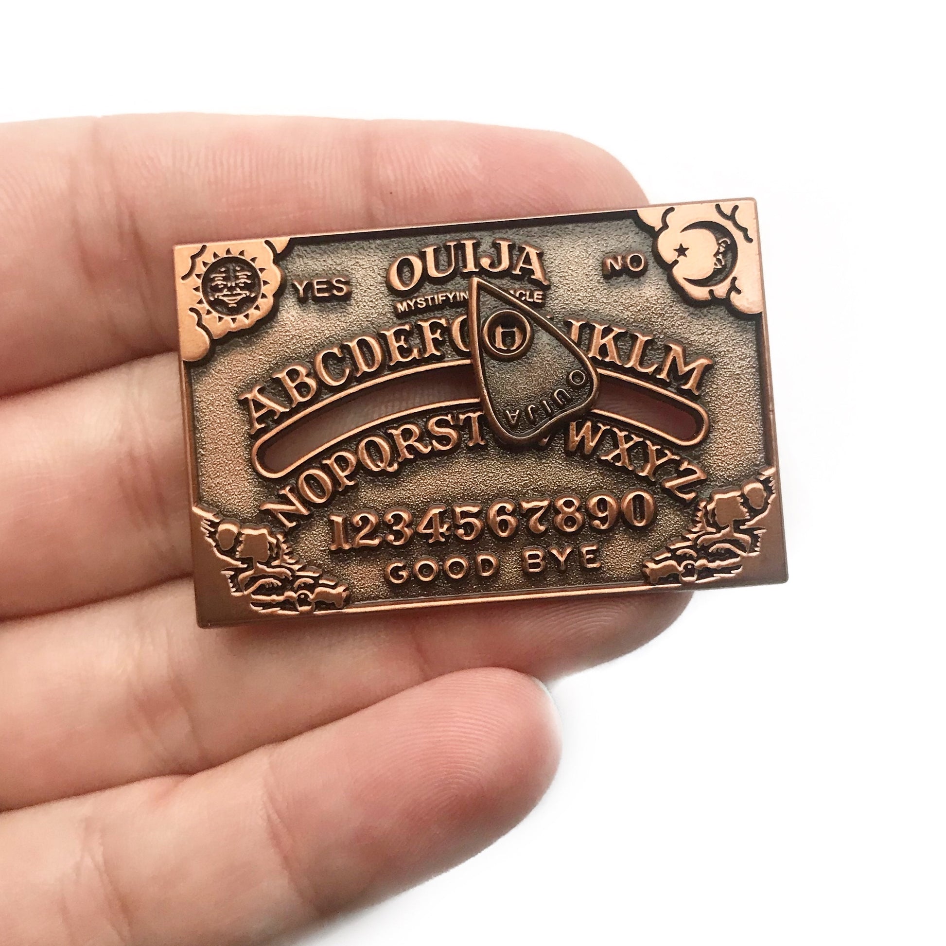 A copper variant of our popular Ouija pin. All letters are accessible by the moving planchette so it really is a working Ouija board!