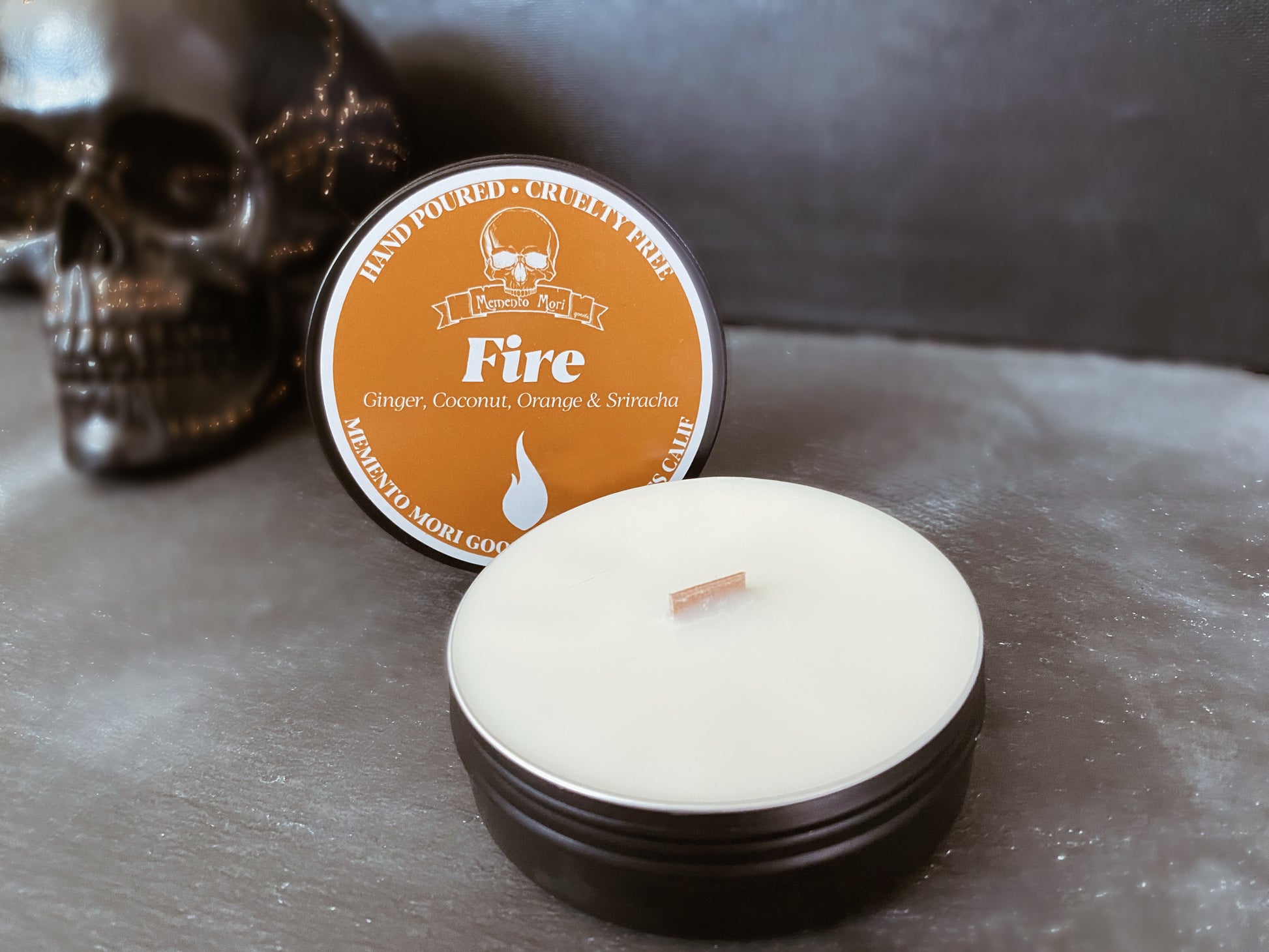 Our "Fire" candle is ginger, coconut, orange and sriracha. it's spicy and smooth. It's sweet with a bite. Perfect for folks who like a little heat.