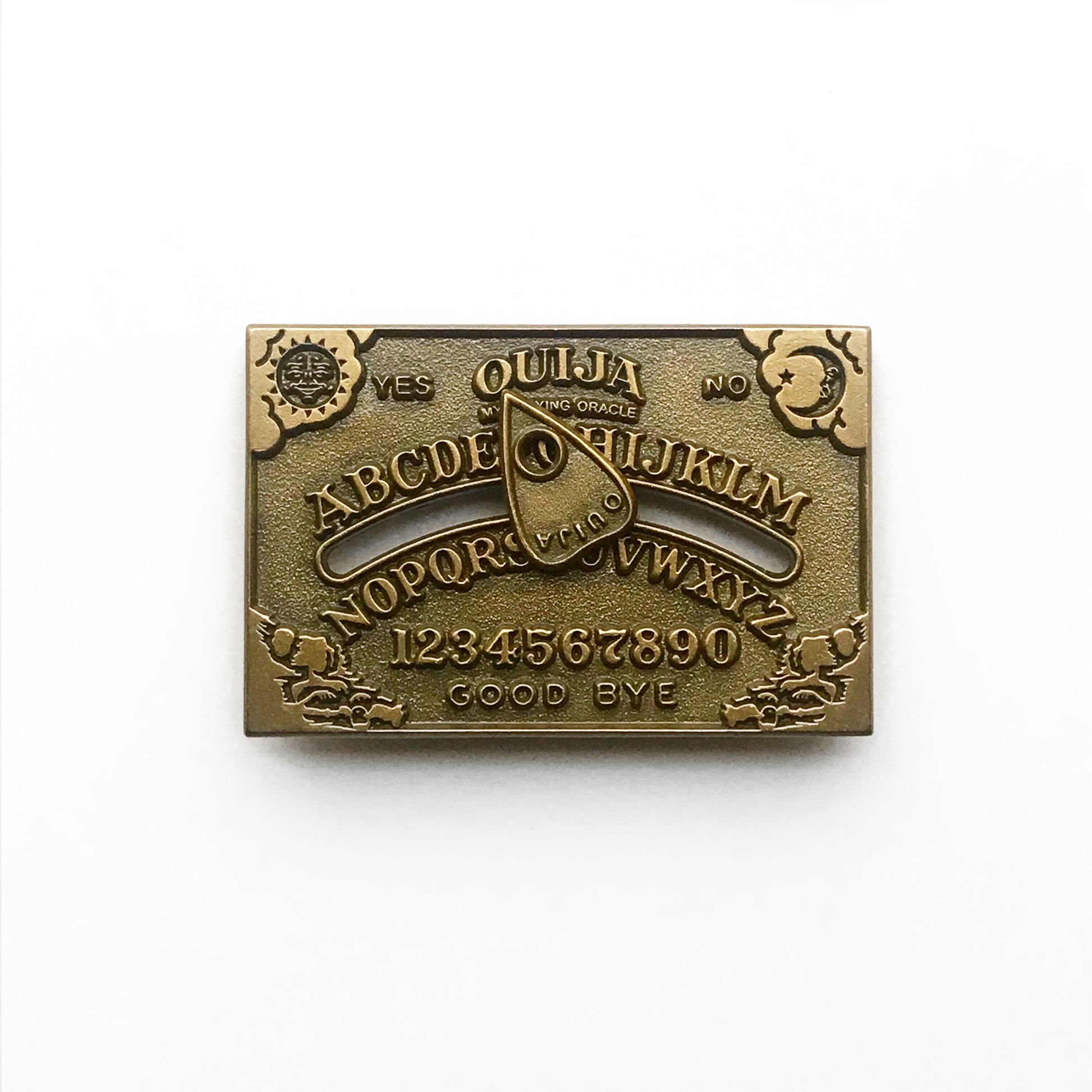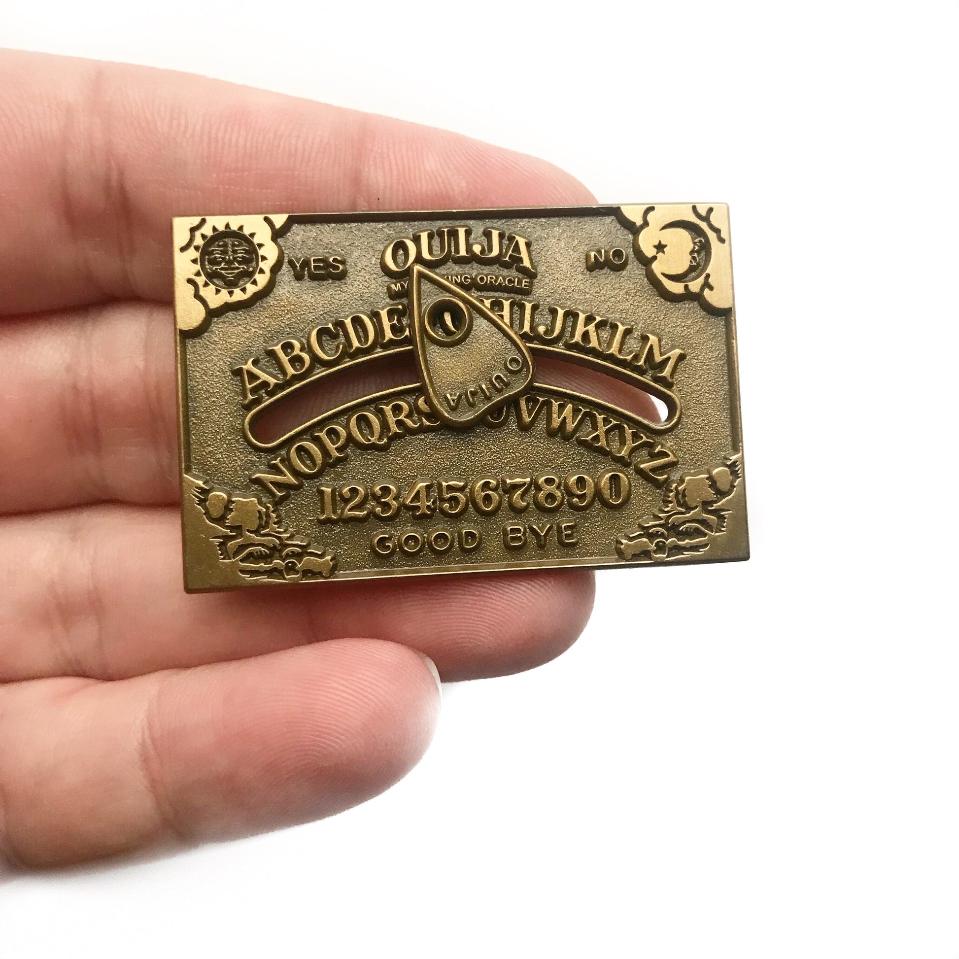 A gold variant of our popular Ouija pin. All letters are accessible by the moving planchette so it really is a working Ouija board!