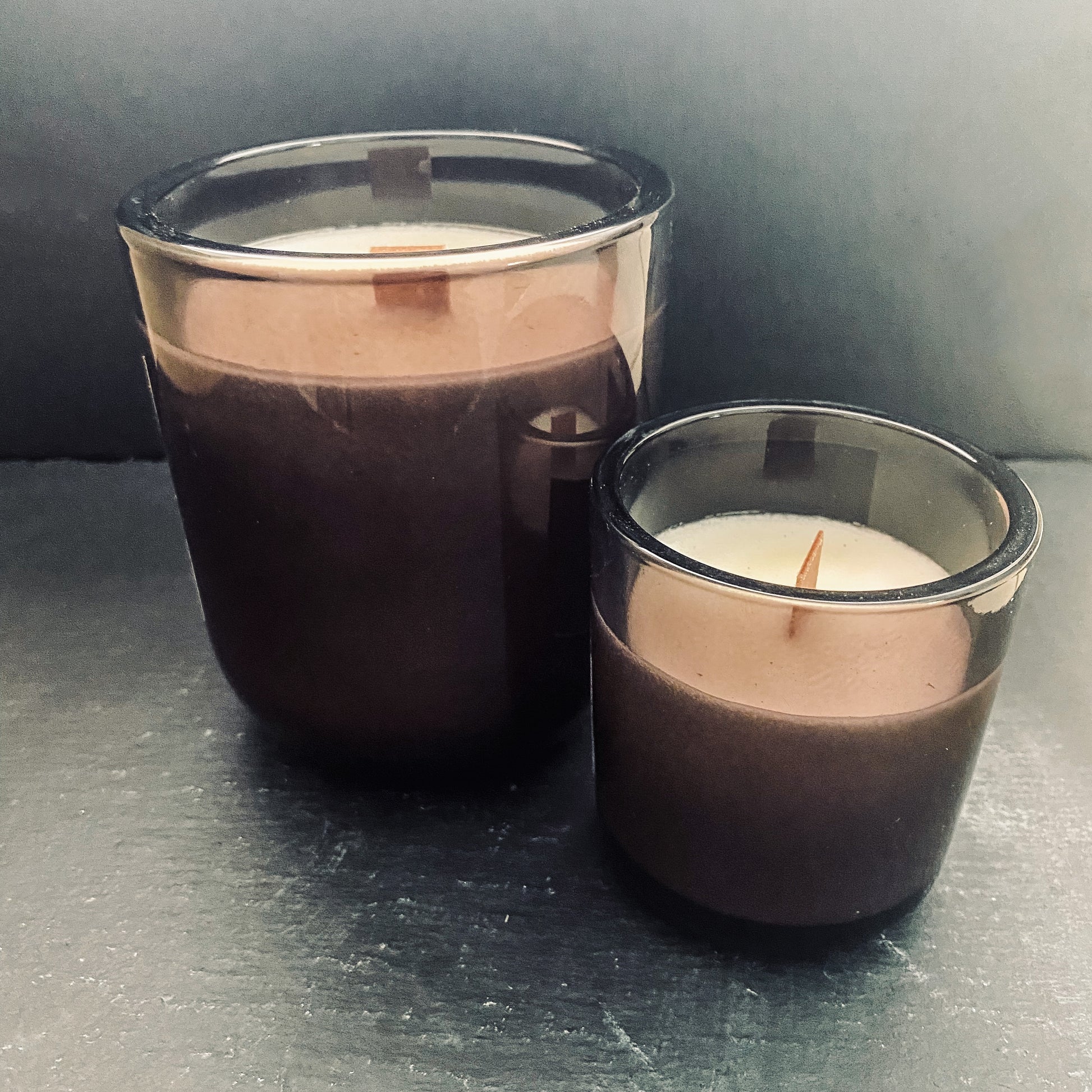The Large Smoke Glass Jar is a 10oz candle with hand poured soy wax in a reusable glass container with a wood wick.