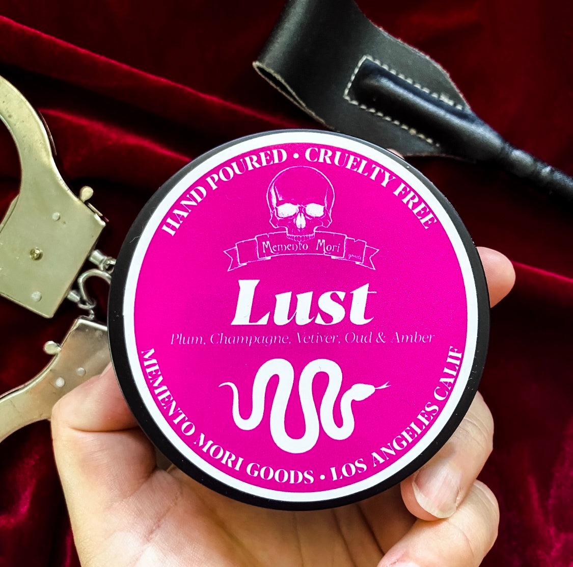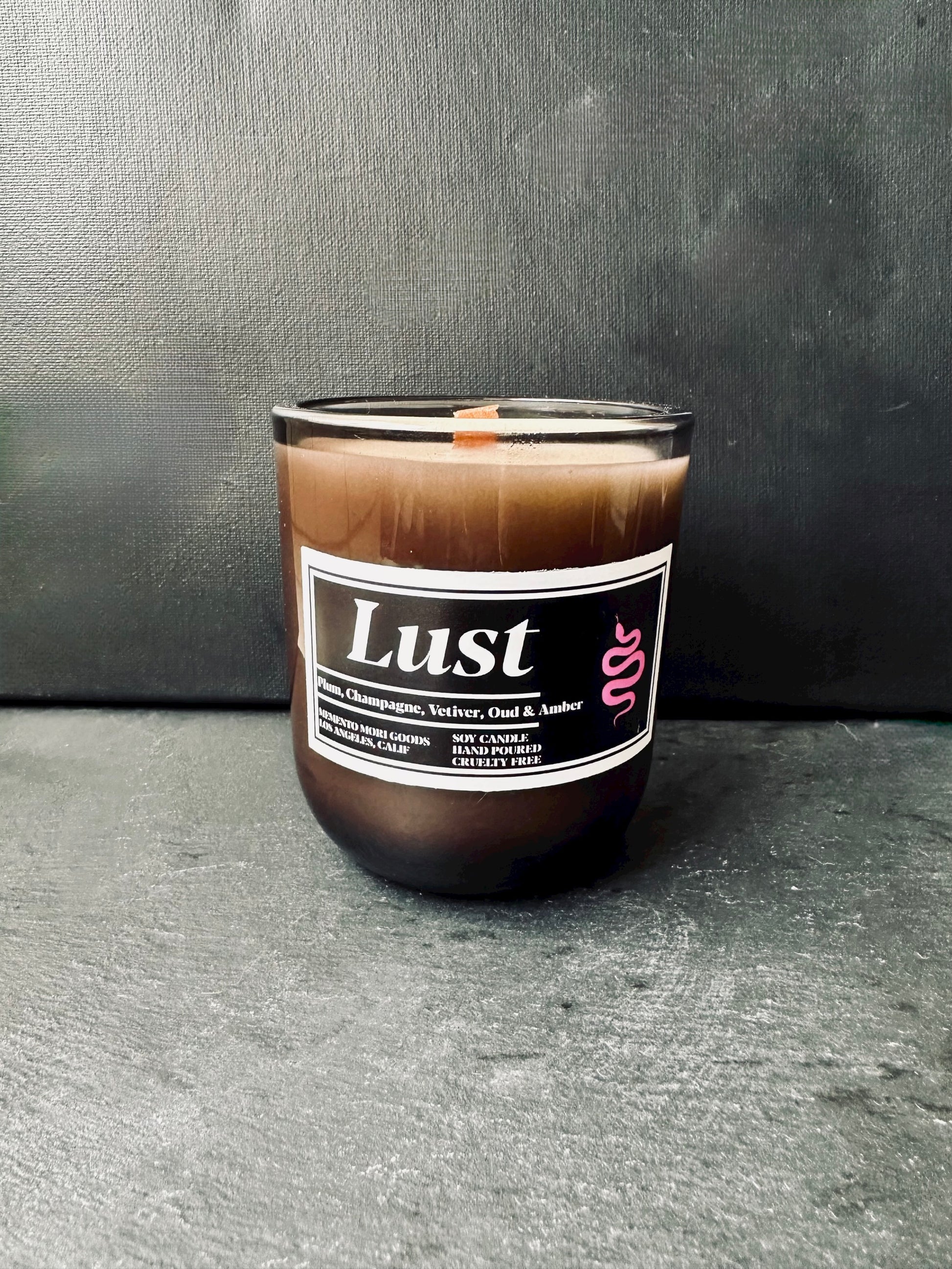 Our "Lust" candle is sinfully good. Moody and alluring with Plum, Champagne, Vetiver, Oud and Amber. This candle smells like a velvet draped boudoir. It's inviting and sweet without being floral. It has darker notes with the oud and vetiver. It's an intoxicating aroma perfect for a slow burn.