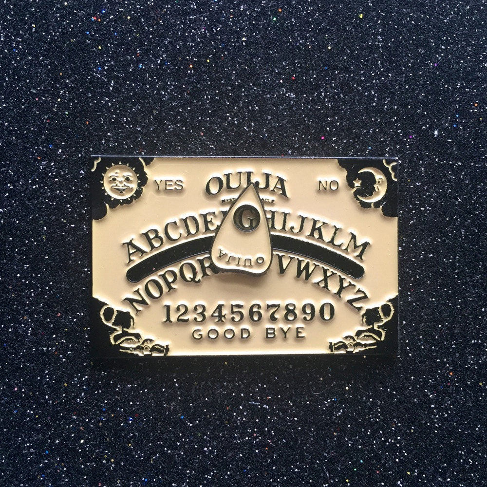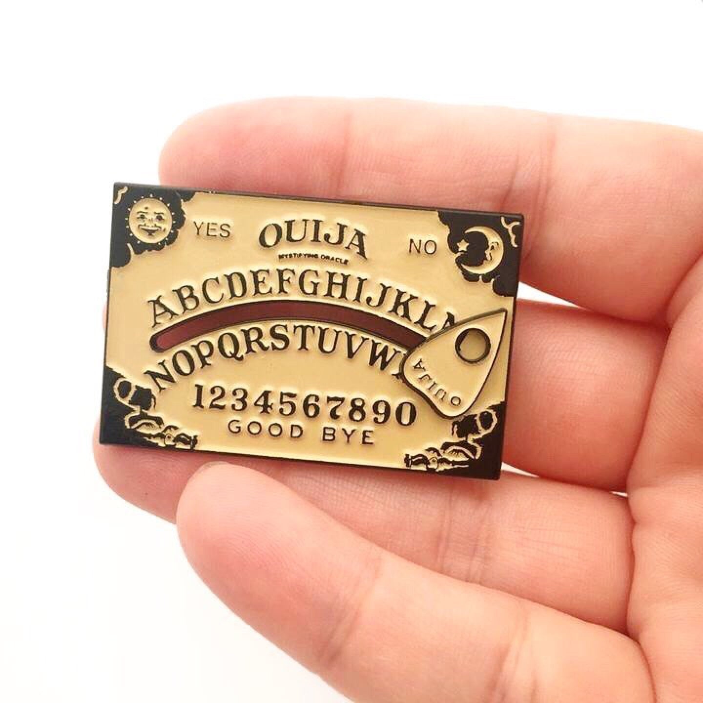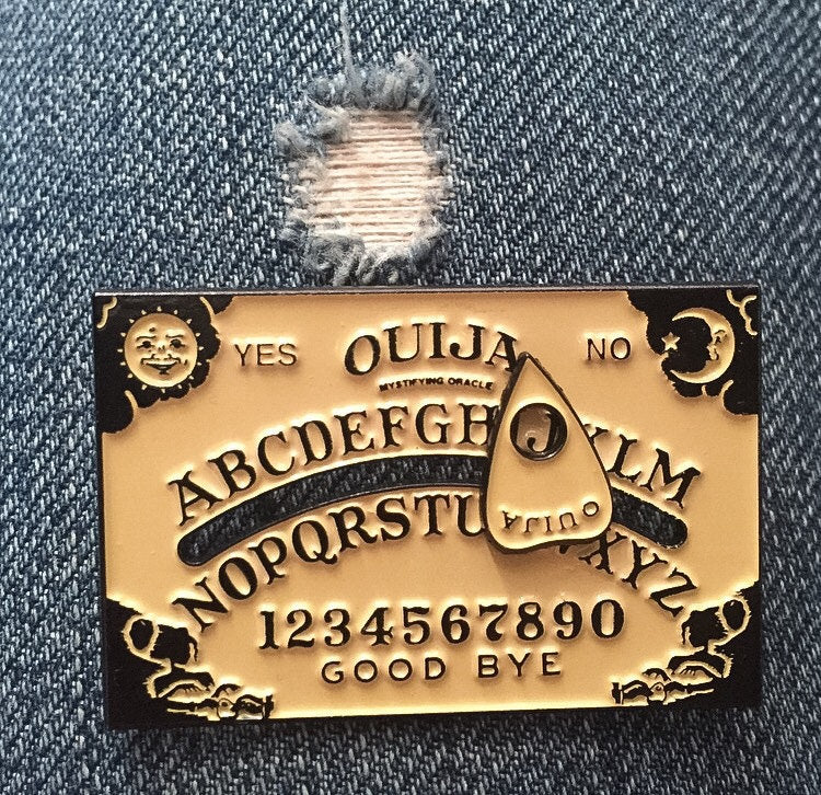Our popular Ouija pin in soft enamel. All letters are accessible by the moving planchette so it really is a working Ouija board! Hold seances at work, in traffic, at the dentist, the possibilities are endless!