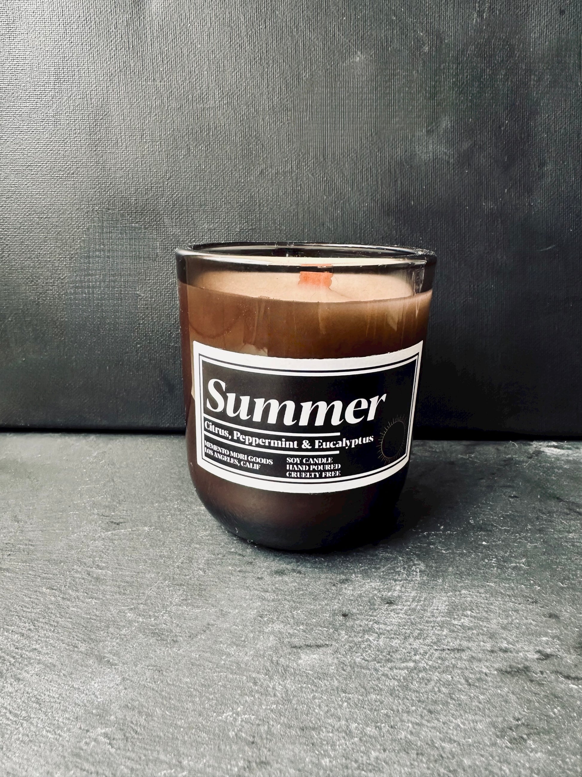 Our "Summer" candle celebrating the solstice is bright and fresh. It has Citrus, Eucalyptus, Lemongrass, and Peppermint mixing together for a refreshing scent.